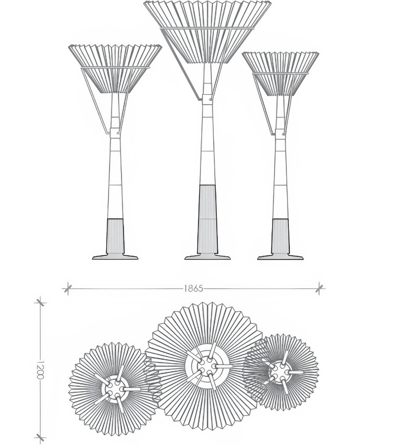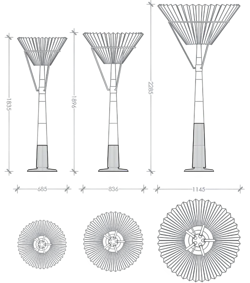 We tried looking at the ruffled fan palm in different perspectives, with a different purpose in mind. The form of the lamp reflects the foliage of Licuala plant and the bollard provides a firm trunk to the lamp.